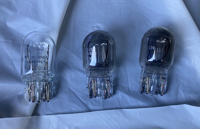 一番右が切れたバルブで、左が新品。で、真ん中はまだ切れていなかったものの交換したバルブです。一見してお分かりいただけるかと思いますが、切ればバルブ程ではないですが、かなりガラス面が黒くなっています。恐らくもう間もなく切れてしまうことは間違いないなかったのではないかと思います。