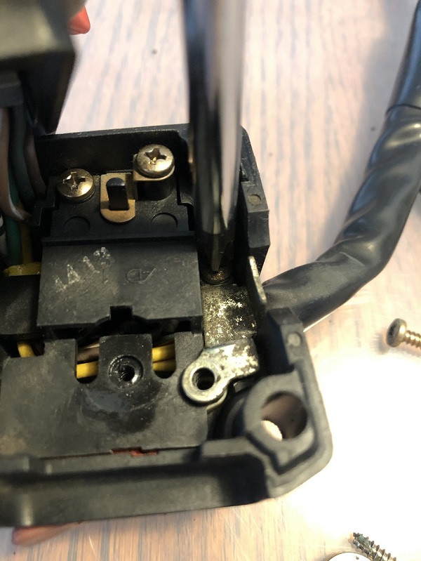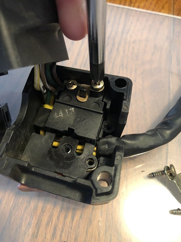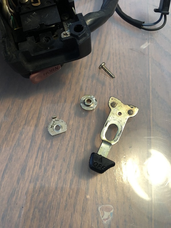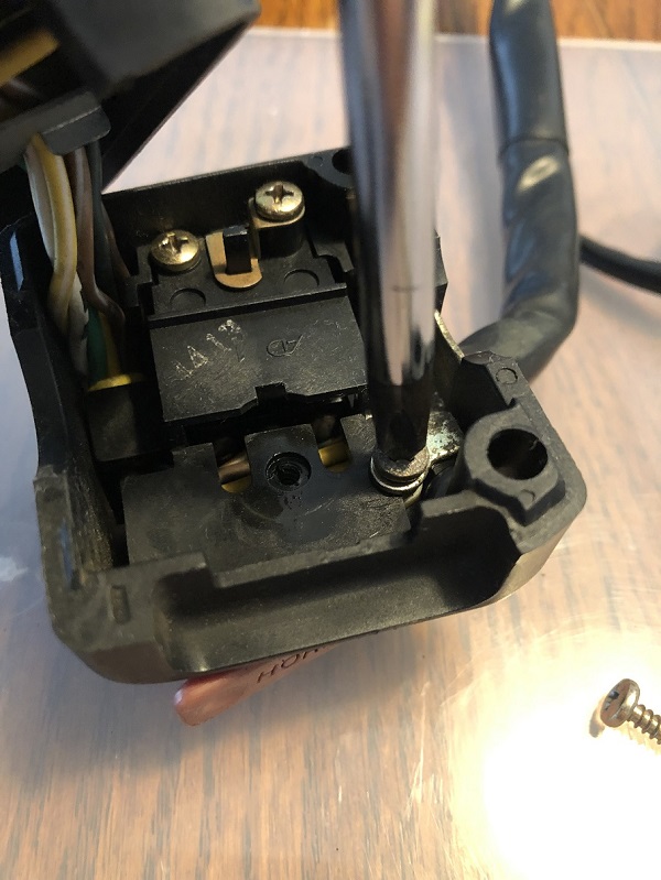 早速バラシていきます。もちろん展開図等ありませんから、都度写真を撮って、元に戻せるようにしておくのは言うまでもありませんね。過去車関連のスイッチをバラした経験から、ビスとカシメで組み上がっていると思われますので、パーツを割ってしまうのだけは避けるよう、注意して作業を進めます。スイッチのウィンカーレバーを外します。