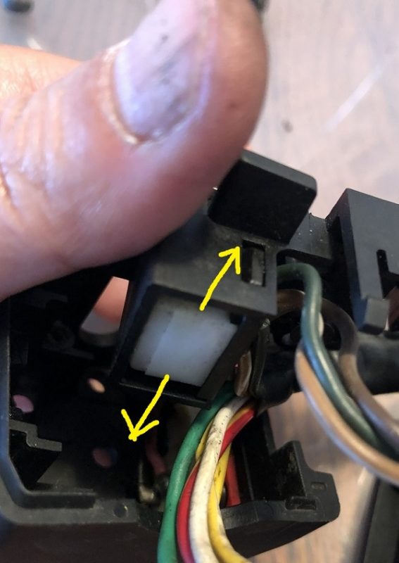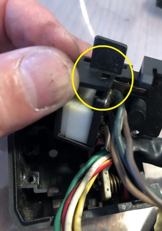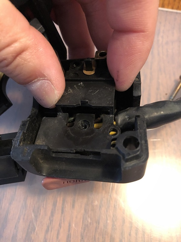 中はこうなってます。ウィンカーレバーを左右に動かすと、中に入っているこの白いパーツが左右に動きます。このパーツに端子が付いていて、通電することでウィンカーが点滅する仕組みになっているようです。