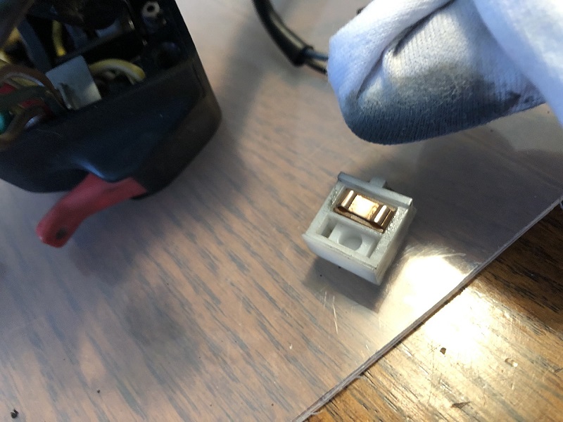 この端子部分にコンタクトグリースを塗布します。以前愛車Y31グロリアのエアコンパーツである、エアミックスドアアクチュエーターのスライド接点部分に使用したものです。滑りながら繋がる端子関連専用品なので、安心なのです( `ー´)ノ