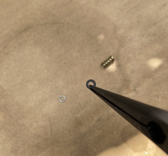 中にパイロットスクリューと組み合わさっているスプリング、ワッシャー、Oリングが残ったままになってしまったので、ピンセットプライヤーで摘出しました。