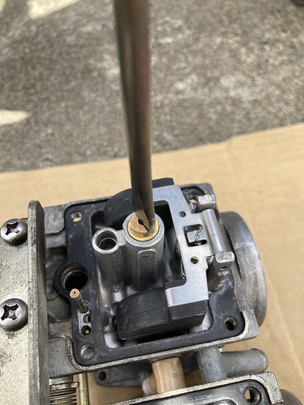 まずメインジェットです。使っているマイナスドライバーは、このメインジェット専用に作ったドライバーです。ご参考までに作り方はこちらをご覧ください↓
