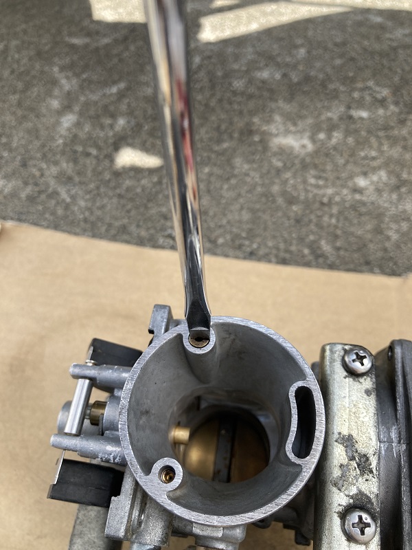 続いてパイロットジェットを外します。このドライバーもパイロットジェット専用に車載工具ドライバーを加工して作りました。同時にエアジェット用ドライバーも作っておりますので、加工方法を知りたい方は下記記事をご覧ください↓