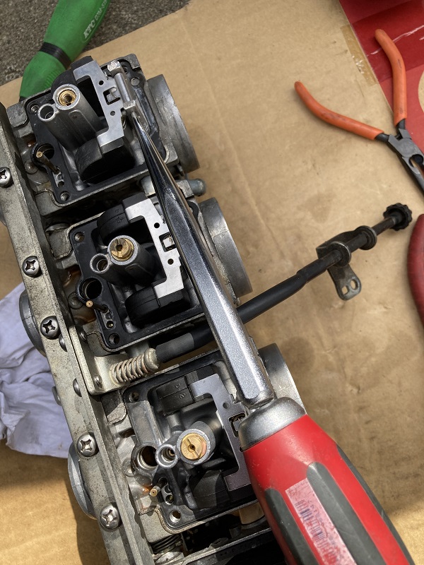 次に4連で繋がっているキャブを分割します。キャブレター本体をキャブレタークリーナー溶液に漬けこみますので、漬けやすい大きさにする為、バラバラにすることにしました。この際、外したジェット類も全て溶液に漬けこみ、汚れを溶かします。