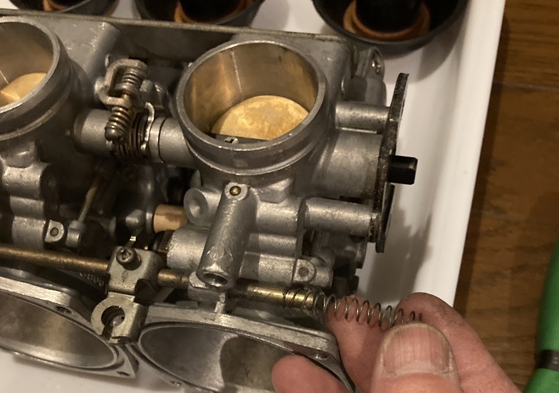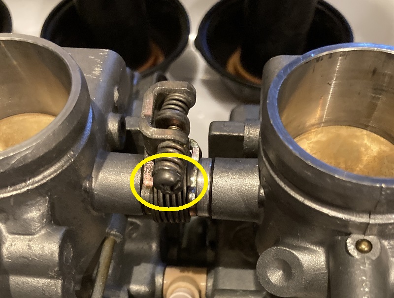 キャブレター同士の間にはまっているスプリングを戻します。