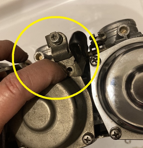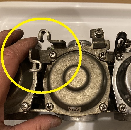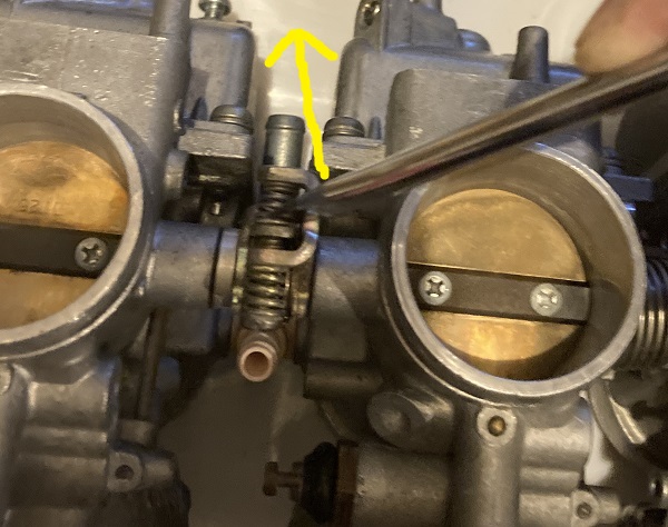 違う角度から拡大してみました。黄色丸のビスはキャブレターの同調を取る時のアジャストスクリューです。これを回すことによって挟み込まれている金属板を押すことで調整の為のシャッター開度を変化させることが可能になります。