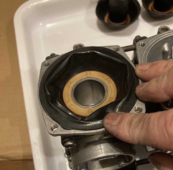 ダイヤフラムAss’yを取り付けます。ゴムの弾性ですぐ溝から外れて浮いてしまいますが、しばらく抑えておくと体温で軟化する為か、溝に沿ったままになります。