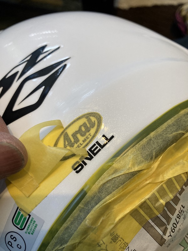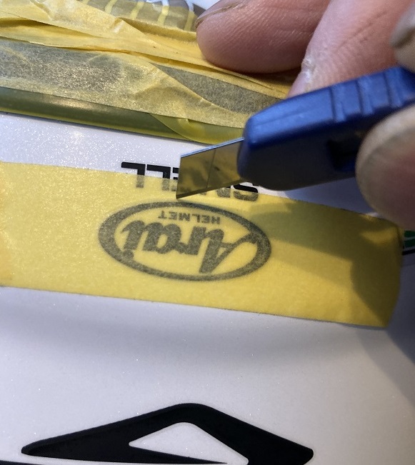 残すことにしたアライロゴにマスキングテープを貼り、回りのラインに沿ってカッターで切り目を入れます。