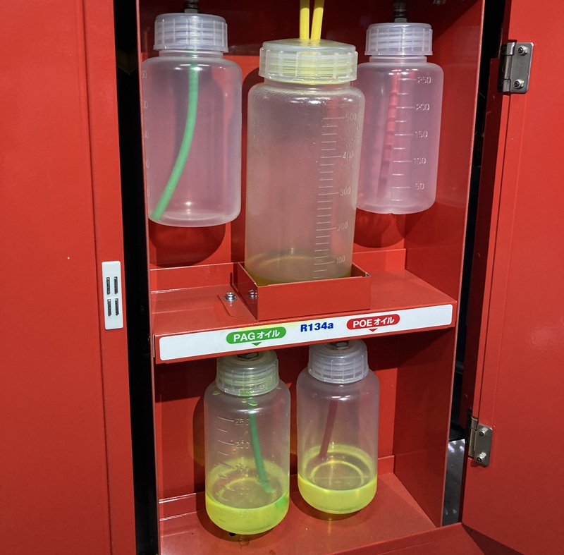 マシン背面の扉を開けると、上の段に回収したコンプレッサーオイルが溜まっています。下の段は新品のオイルで、色と濁り方の違いが一目瞭然ですね。この濁り方を見れば、コンプレッサーオイルも定期的に交換すべきであるなと強く感じます。