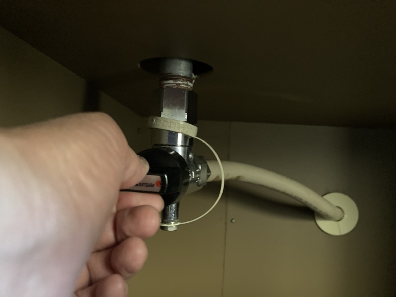 続いてコンロの下に接続しているガス管の栓を閉めます。