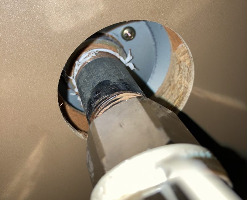 下から覗くと、こうなっています。ヒゲみたいな白いピロピロは、ねじ込む際に巻くシーリングです。実は写真撮り忘れたので、一度外した後に再度取り付けたらこうなってしまいました(~_~メ)。
