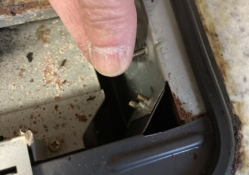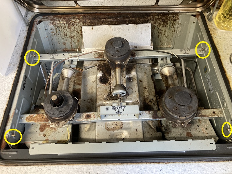 このビスはねじ込み固定ではありません。四本をバランス良く回してつっぱり棒のように開口部の内壁に押し付けることでコンロが動かなくなり、固定される仕組みとなっています。実は新しいコンロの固定方法もこれと全く同じなのです。