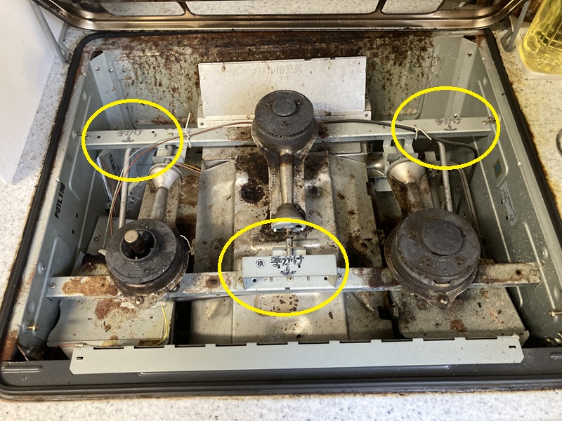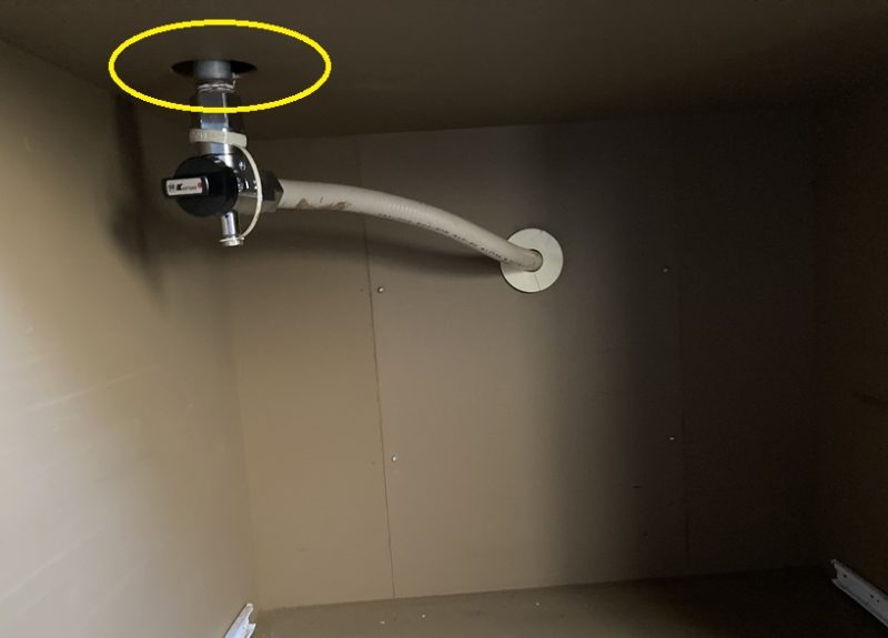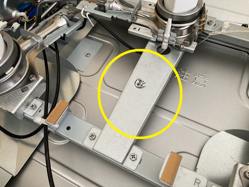 ガス管は黄色丸の箇所で、コンロの下に付いているガス接続口にねじ込まれています。