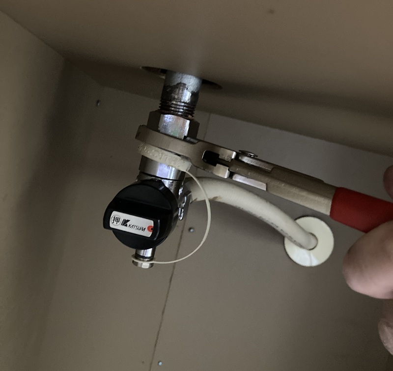 管理人はプライヤーレンチで外しましたが、大き目のモンキーレンチ、もしくは水道管を外す際に使用するモーターレンチでも外れると思います。