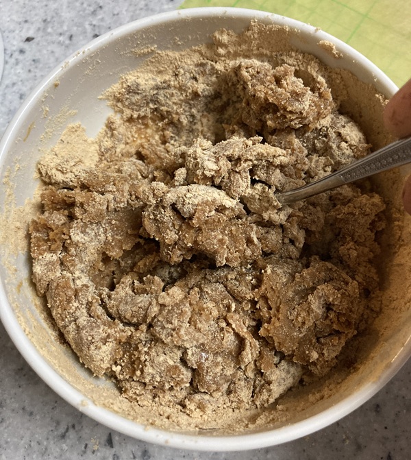 レンジで加熱した後、取り出してみると、きな粉の中の方がぷにぷにしているのが分かります。