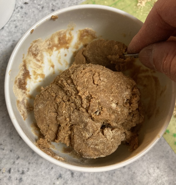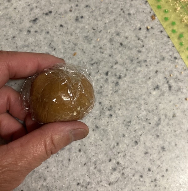 今回はすり黒ゴマまぶしバージョンも作りますので、その分はラップに包んで取り分けておき、残りのキャラメル生地を器に入れ、乾燥防止にラップをかけておきます。