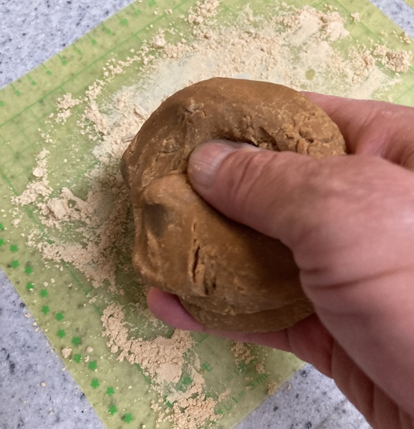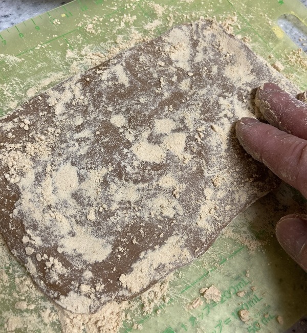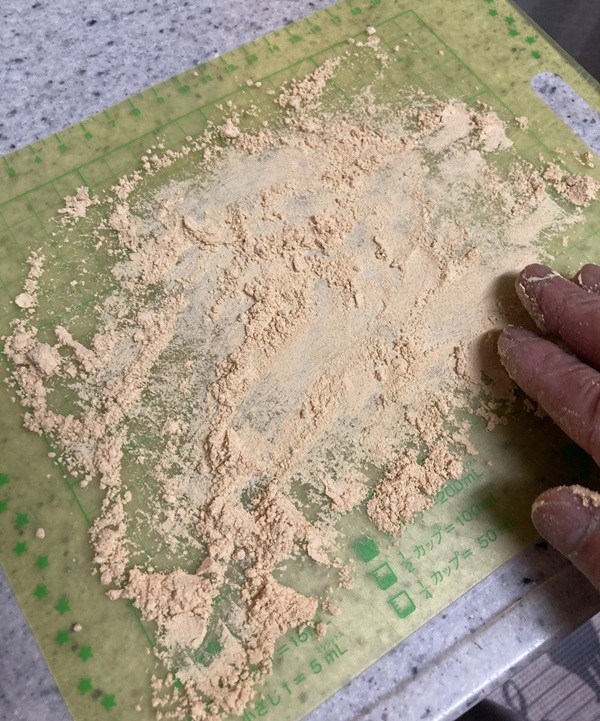 まな板にくっつかないようにする為に打ち粉としてきな粉を伸ばします。管理人はこの作業をする際、樹脂製のまな板を使用しています。