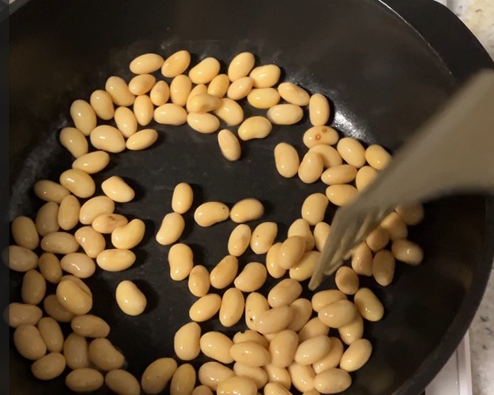 そこで火を止めて、そのまま混ぜながらフライパン温度を下げます。普通戻し大豆を煎る場合は弱火にして更に煎り続けますが、管理人が『歯ごたえのある柔らか大豆』の食感が好きなので、ここで煎りを止めます。