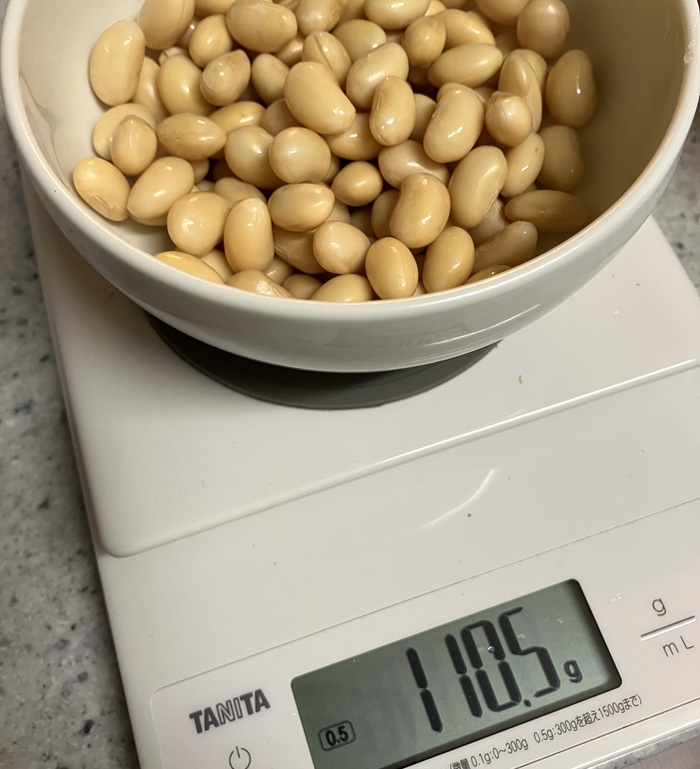 水で戻した220gの大豆を半分にします。