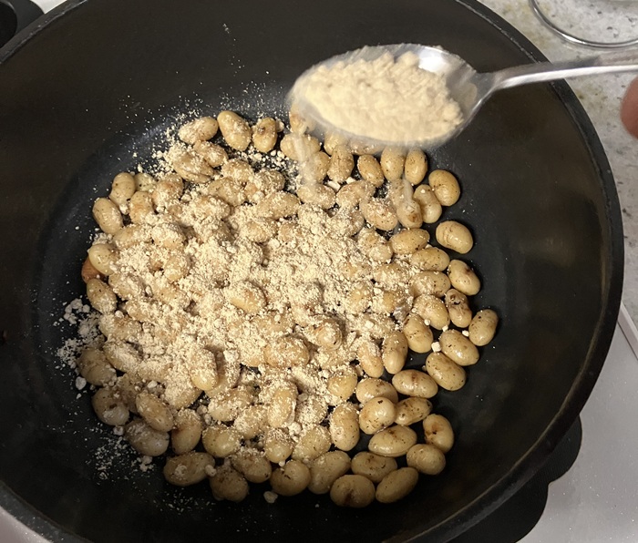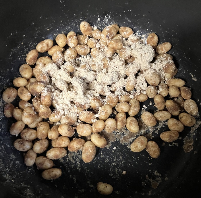 大豆に黒糖きな粉を振りかけます。