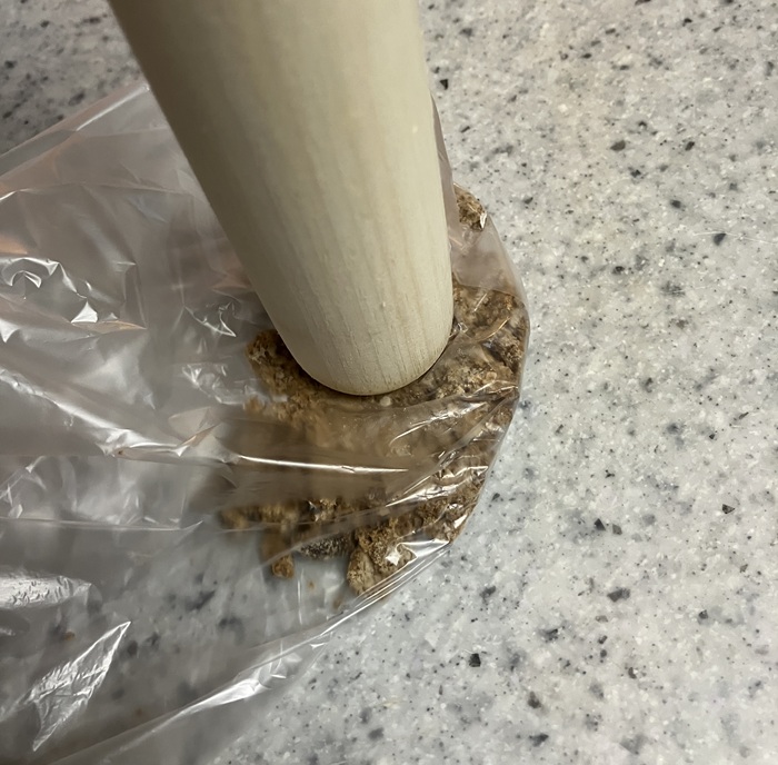ビニール袋に黒糖ブロックを入れ、スリコギで叩いて粉状態にします。