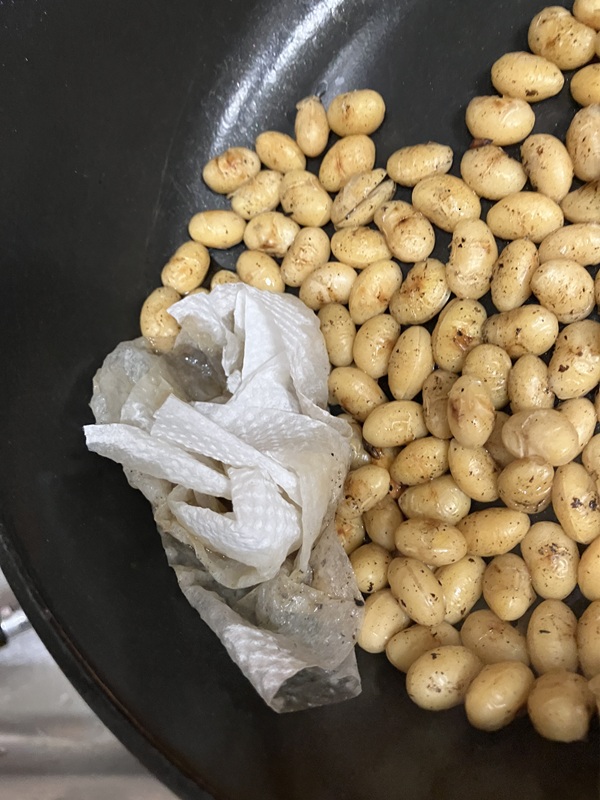フライパンの温度が十分に下がったら、大さじ2杯ほどの水を差して、フライパンを揺すって全ての大豆に水を行渡らせます。フライパンの中に溜まった水(既にお湯)は焦げが溶けて黒っぽいお湯になっているので、キッチンペーパーで吸い取っておきます。
