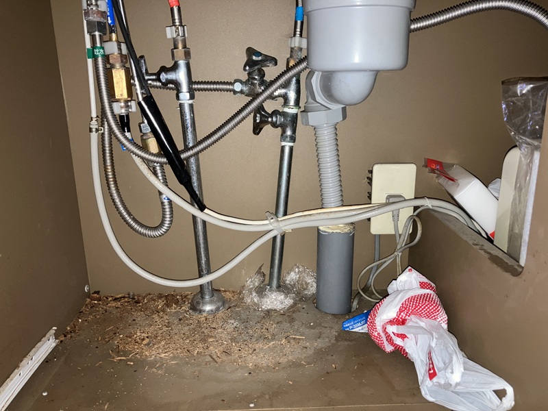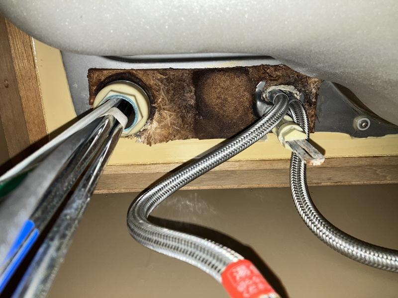 問題は取り付け箇所の下地です。水栓を取り付けているステンレス流しはステンレスの厚みがないので、補強の為に間に木材をかまして取り付けをしています。その木材が水分を吸ってボロボロになってしまってしまい、締め付けがゆるゆるになってしまった為、水栓の根元に隙間が空いてしまっています。そこから染みてきた水で木材が更にぼろぼろになってしまうという悪循環が発生してしまったと推察されます。この緩みに気づいてから、緩くなる度にレンチを締め付けて都度隙間をなくすようにしていたのですが、根本原因である劣化した木材を交換しない限り焼け石に水であったようです。