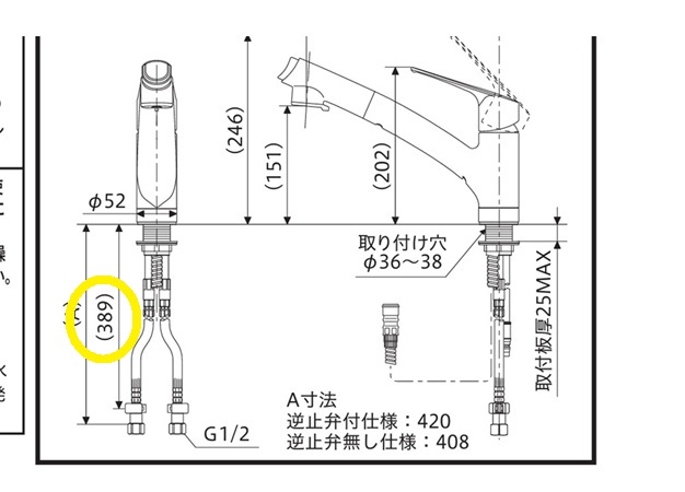 現在シャワー水栓が取り付けてあるステンレスの下から止水管までの長さが、これよりも長い場合は当然ホースが届きませんので延長ホースを追加購入しないと取り付けが出来ません。管理人の場合、この寸法は約30センチでしたので、間違いなくホースが届くのでOkです。