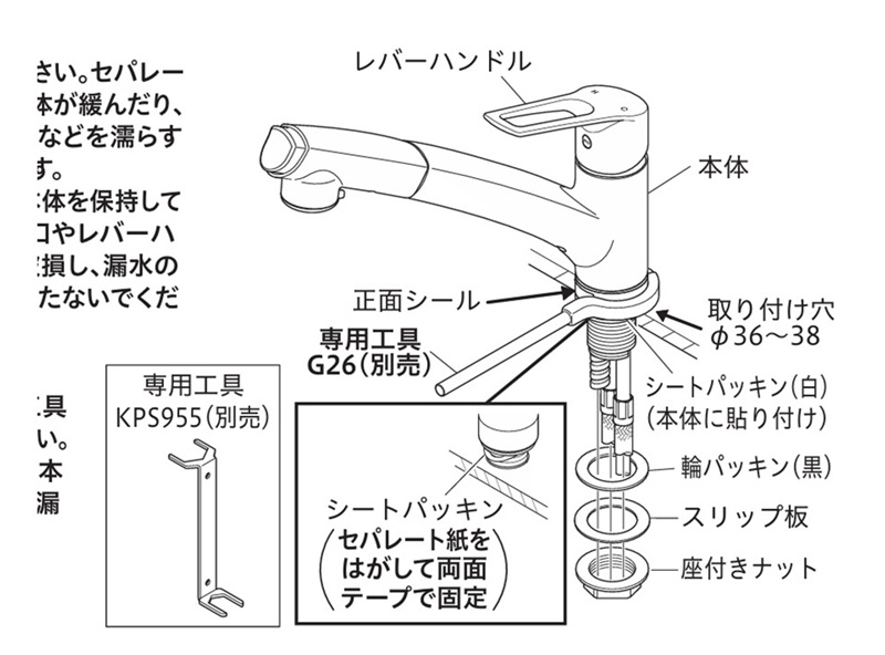我が家に取り付けていた水栓の固定方法は、取り付けているフレキシブルレンチによる締め付けですが、現在は大きく分けて下記二通りであるように思われます。今回購入することにしたKM5021にも二通りの品番があり、ひとつは『大きいナットで下から締め付ける』方法、もう一つは『上からボルトで締め付けリングを持ち上げる』方法です。