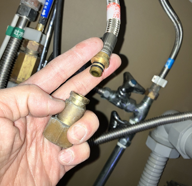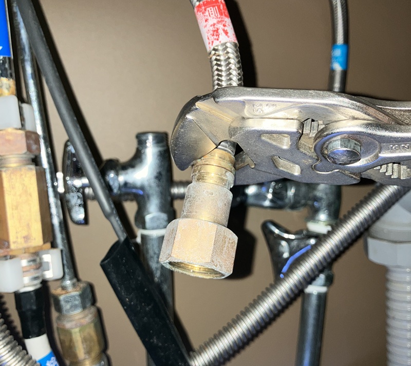 あっけなく外れました。止水栓からそのままジョイントを外そうとしましたが、かなり固くて手だけでは外せませんでした。そこでプライヤーレンチでブレードを抑えてジョイントを回したところ、外れました。