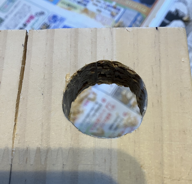 木材をカットします。一度寸法通りに木材を切り出そうとして中止しました。こういったケースの場合、木材を先にカットした後に穴開け作業をすると、作業がムッチャやり辛くなってしまうことを思い出したからです。