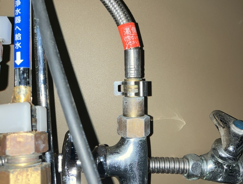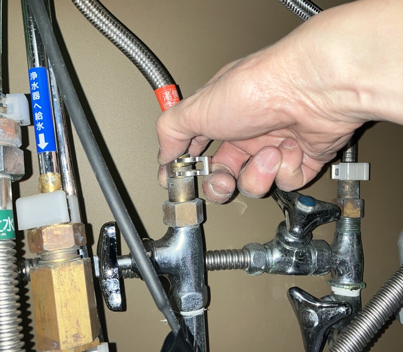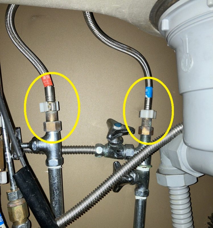 取り外すには元栓を閉めなければなりません。下記黄色丸の箇所の元栓を閉めます。我が家の場合、隣に浄水器を設置していますので、残りの一つの元栓はこちらに水を流しているブレードの元栓ですのでここはそのままにしておきます。