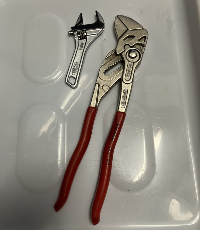 ジョイントを脱着する工具は、ジョイントを傷をつけることがないモーターレンチやモンキーレンチがお勧めです。意外と狭い場所なのでモーターレンチは使いづらい為、手持ち工具の中、小ぶりのモンキーとプライヤーレンチを準備しておきました。