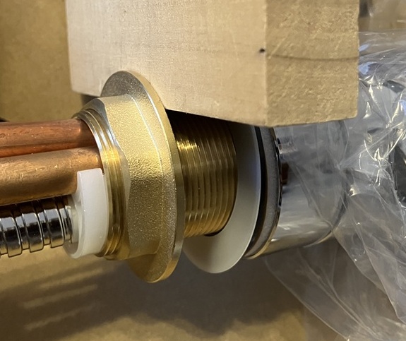 19mm厚のパイン材の端材があったので、それを使用できるか、本体留めナットとステンレス流しの間にかまして厚みが問題ないかを確認してみます。ナットがしっかり取り付け可能なので大丈夫ですね(^・^)。