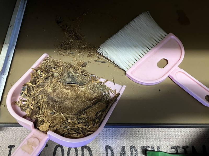 ちらばった木片を掃除します。