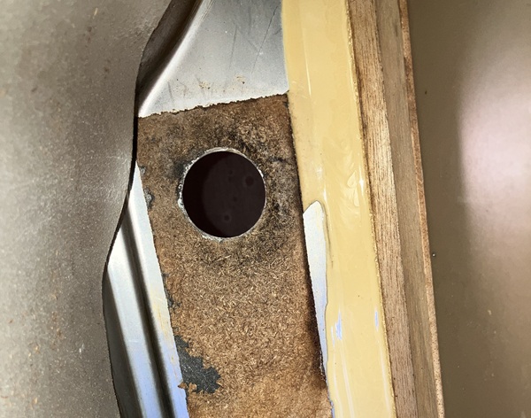 ステンレスの裏側には朽ちた木材がまだ張り付いていますので、車整備で使用している樹脂製内張ハガシを使って残っている木片を出来る限り削ぎ落します。
