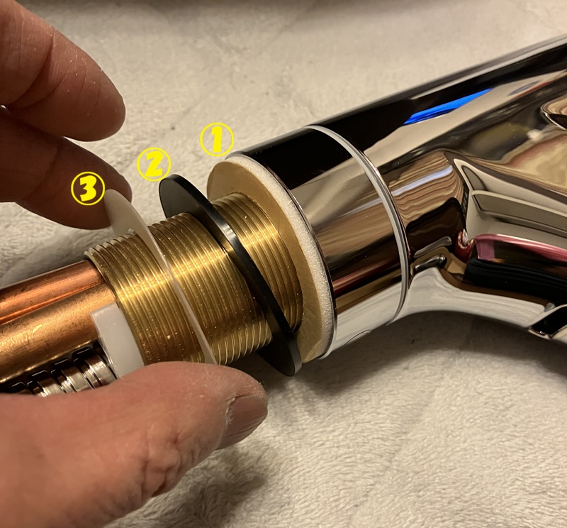 ①は本体に付いているシートパッキンで、セパレート紙を剥がして台座に貼り付け固定します。つまり①と②の間にステンレス流しの台座がサンドイッチされる形となります。②はゴム素材の輪パッキンで、③はスリップ板と記載されていました。③の下がナットですから、確かにこれがないと滑らないゴム素材の輪パッキンでは締め付けることが困難となってしまいます。