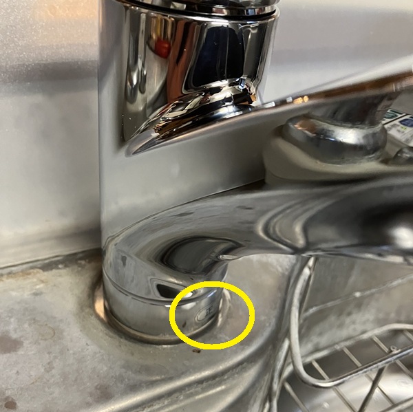 水栓下には『正面』と記載されたシールが貼ってありますので(画像では黄色丸の箇所)、これを参考にしますが、取り付け後を想定しシャワーヘッドを左右に振ってみると、場合によっては正面ではない方が使い勝手が良いことに気づく可能性が大です。