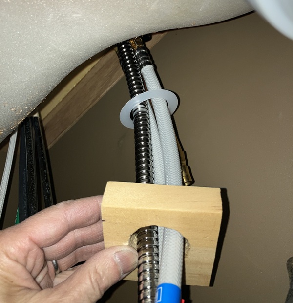 ②と③、どちらの下に木材をかませるのかでちょっと考えましたが、木材でナットが滑らないことはないでしょうし、輪パッキンを木材で押し付けるのもどうかという気がしましたので、木材は③の下に入れることにしました。