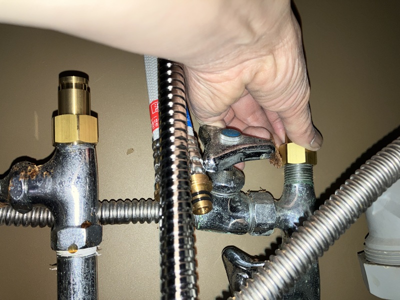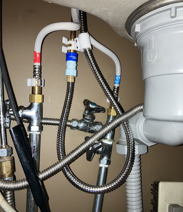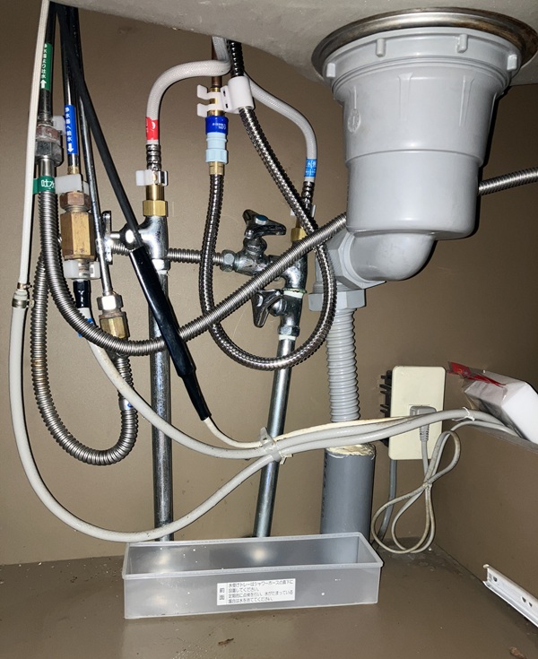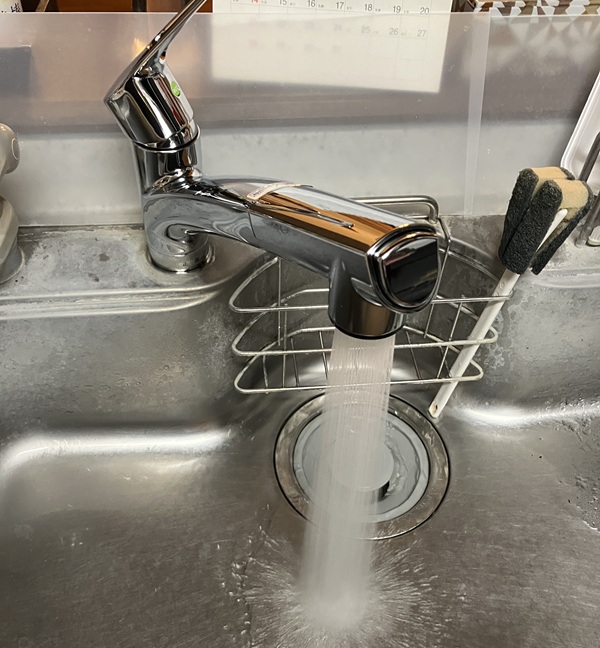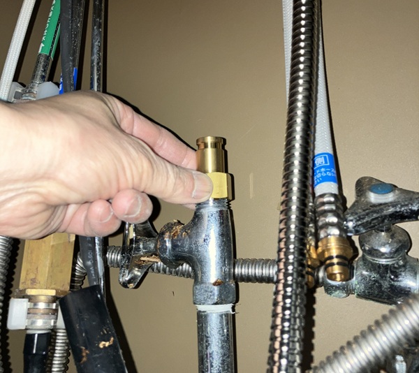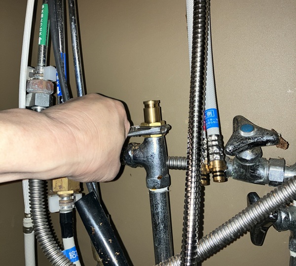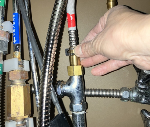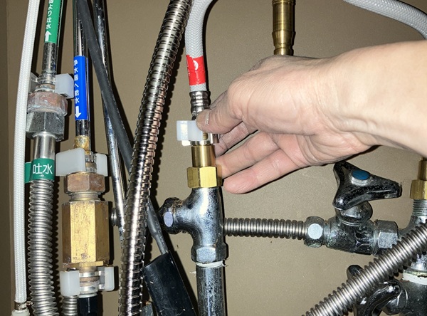 では取り付け時に接続した箇所から漏れがないかを確認します。取り付け時に閉めた常温水&温水の止水栓を開けてから、水栓のレバーを操作します。