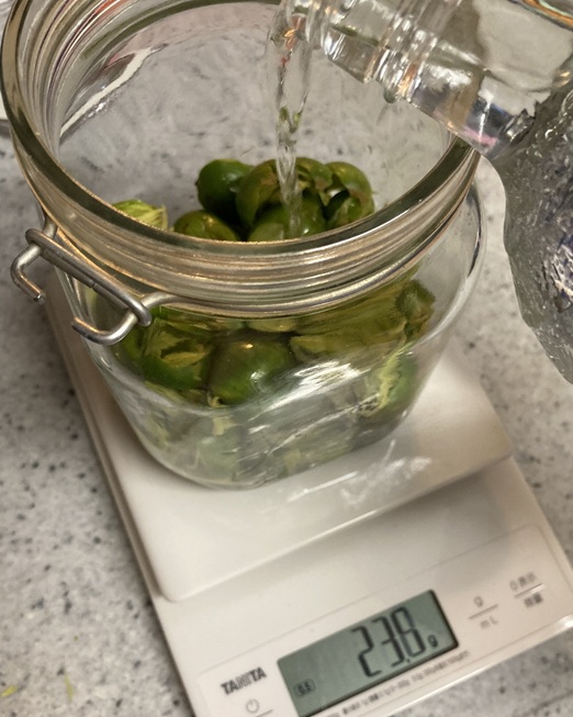 採れたてのカヤの実を良く洗い、氷砂糖と一緒にウォッカに入れました。かなり長く漬ける必要があるのだろうなと思っていましたが、2時間ほど経ってから見てみると、既にウォッカが薄茶色になっておりましたので慌ててカヤの実を取り出しました。