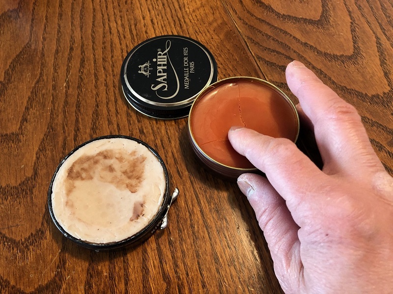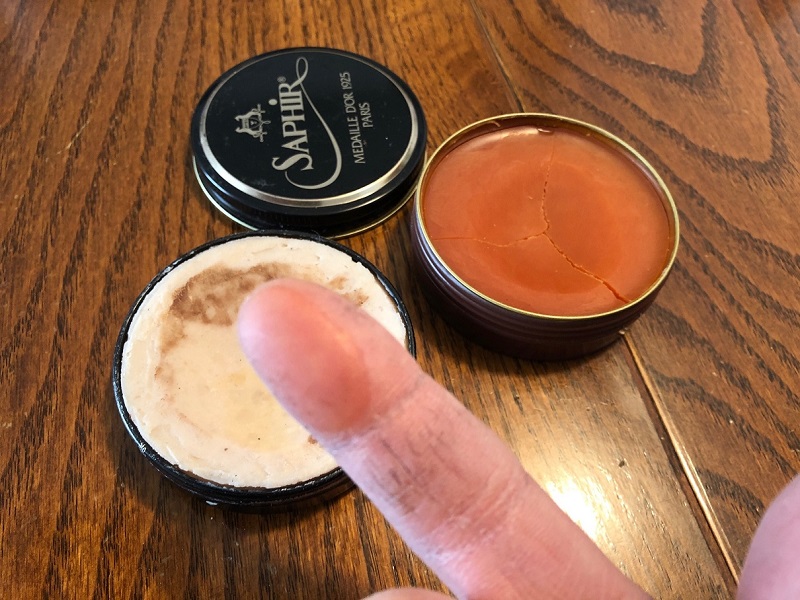 なので有機溶剤が活きている靴墨と硬くなった靴墨を混ぜると、硬くなった靴墨は軟化、つまり柔らかくなります。なので、まず柔らかい靴墨を指で溶かし取り・・・