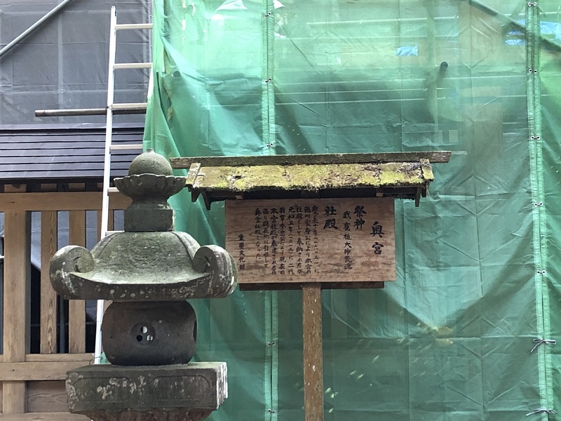 この後、本年(令和4年)の中頃から令和6年の上旬までが拝殿、本殿が改修予定なので、もうしばらくすると拝殿もこのように作業シートで覆われる可能性大です。お参り予定の方は早めに来られた方がよろしいかと思います。