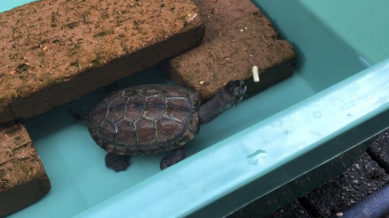今回屋外飼育にしたのは、親亀同様に冬場は冬眠させるようにしようと思った為です。生まれて間もない子亀は、体力がなく冬眠に失敗する恐れがありましたので屋内飼育をしていましたが、年齢も3歳になりましたので、今年の冬は初冬眠にチャレンジする予定です。