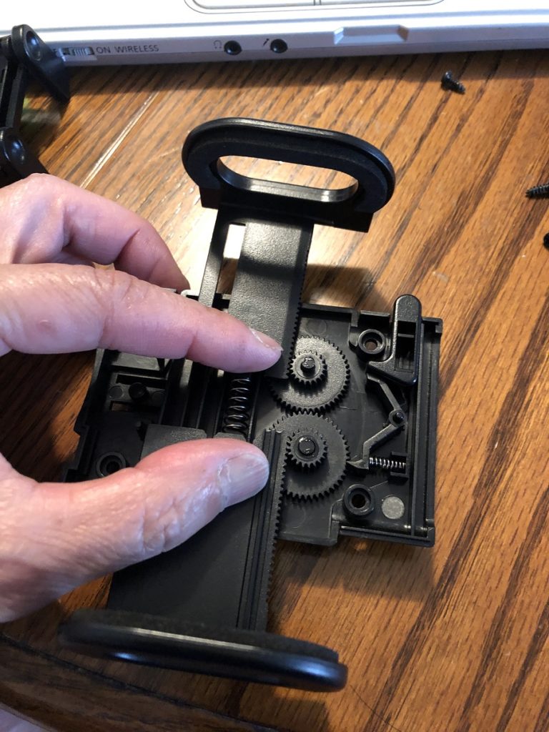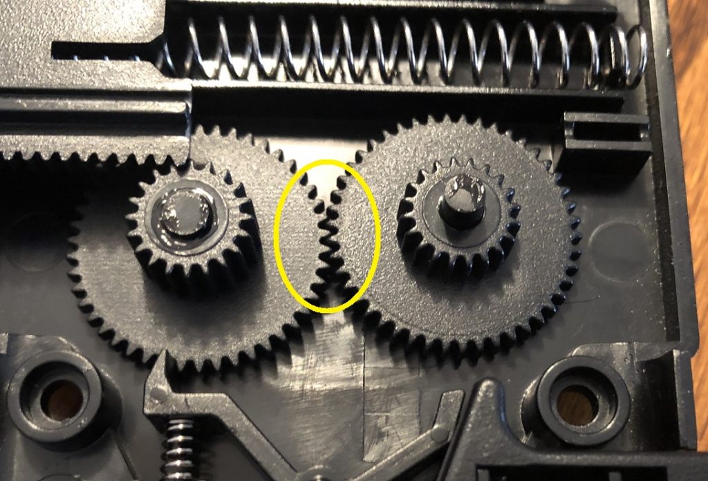 ここの連結で左右のアームの動きも連動しているのですが、ここの噛み合わせが実は甘いのです。歯車のリリースボタンを押した際、バネの力は思った以上に強いので、結構な勢いでアームが開き、右側の歯車が一気に回ります。その時噛み合わせが甘いこの部分が空回りし、右のアームは開くが、左のアームは開かないといった現象が発生。それが左右差になっていると考えられます。