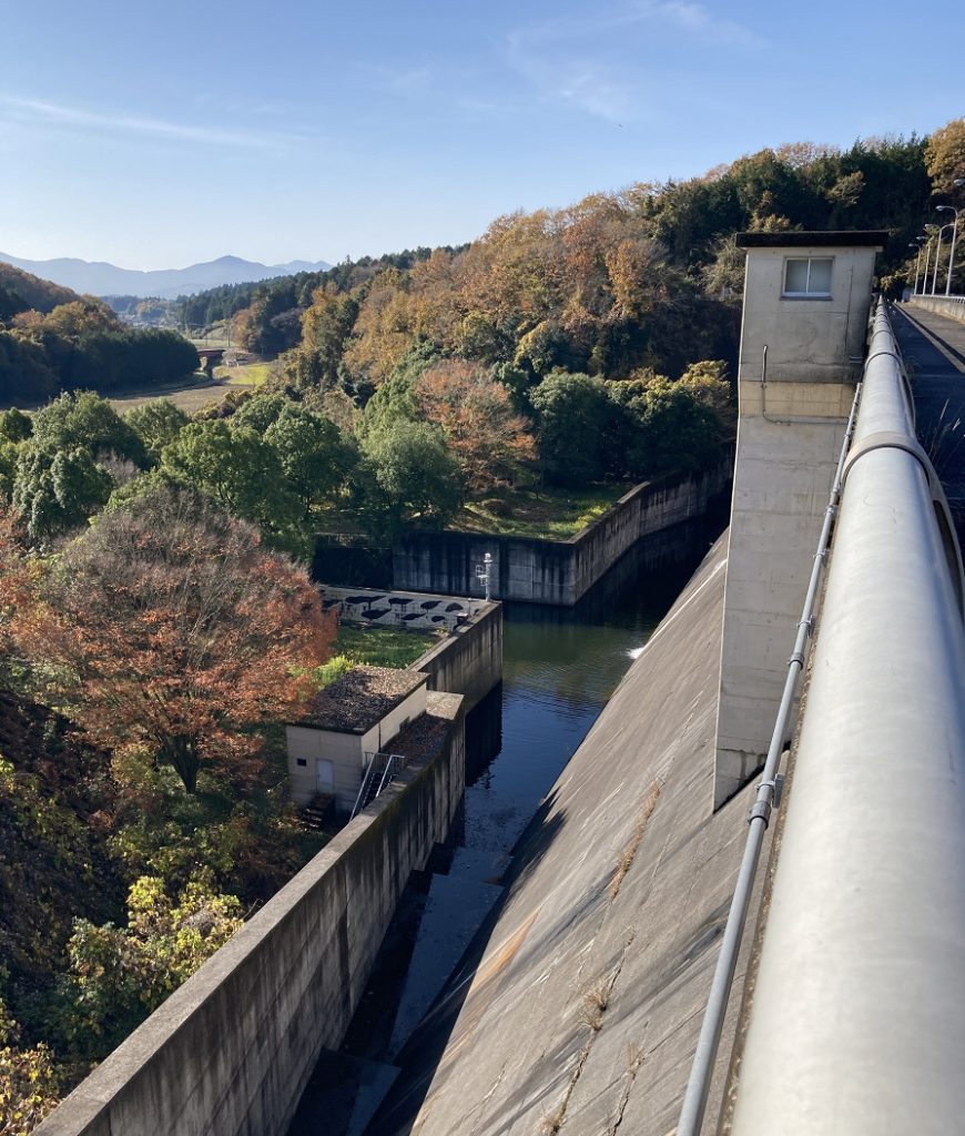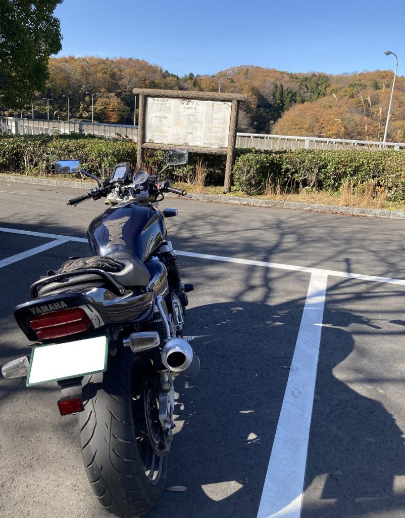 ビーフラインに入ると、道路にカタカナで『ビーフライン』と表示されていますので、そのまま道なりに走っていきましょう。走り出してほどなく、スマホナビ画面に笠間湖が表示されましたので、笠間湖にある飯田ダムに寄り路してみることにしました↓