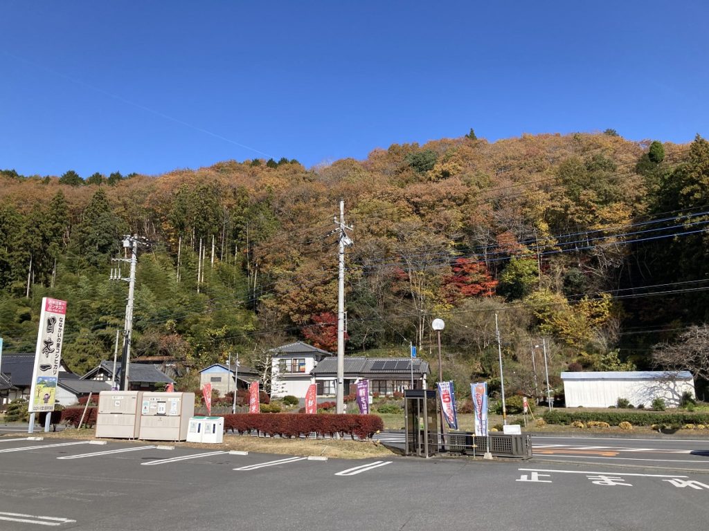 駐車場から山側を眺めてみると、紅葉がちらりほらりと見えます。
