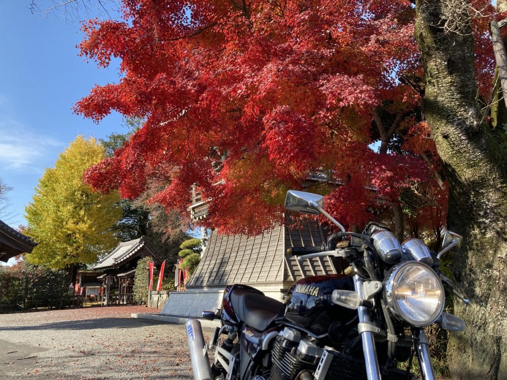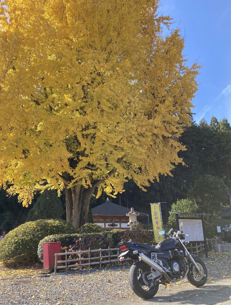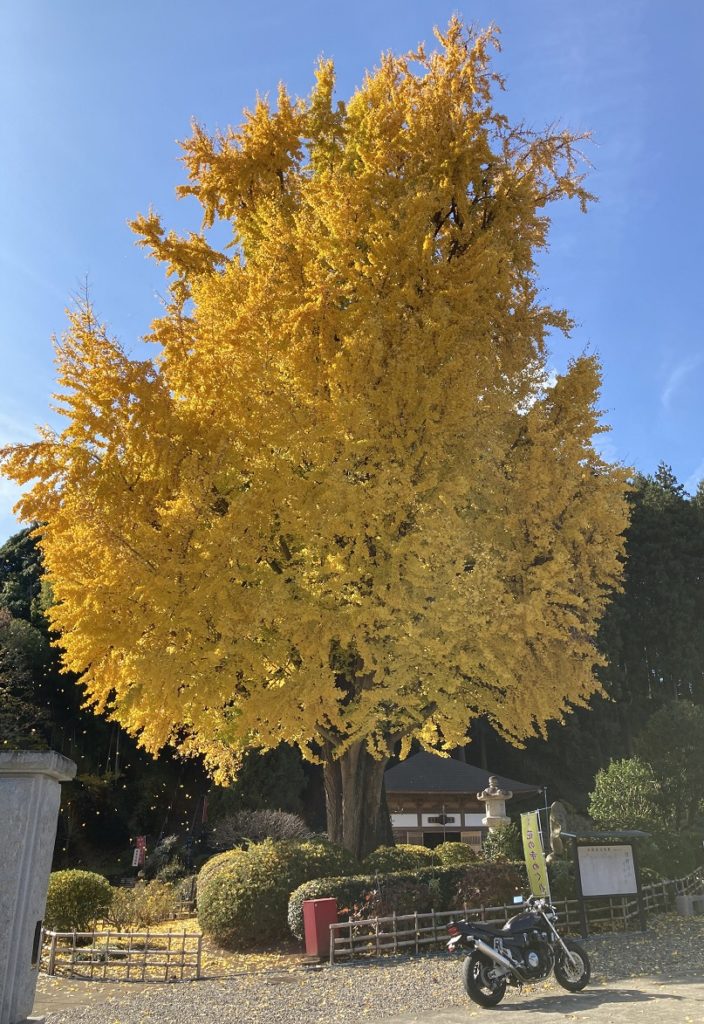以前茨城県内の巨樹巡りをした時に立ち寄ったのがこちらのお寺なのです。お寺にあるイチョウの木は、茨城県の銘木・巨樹100選に選ばれており、樹齢は480年と判定されているそうです。全国的に1,000年越えのイチョウの木も珍しくない中、樹齢はそれほどでもないものの、このイチョウは樹形がとても美しく、何よりバイクが一緒に記念撮影することが可能なのです!!↓