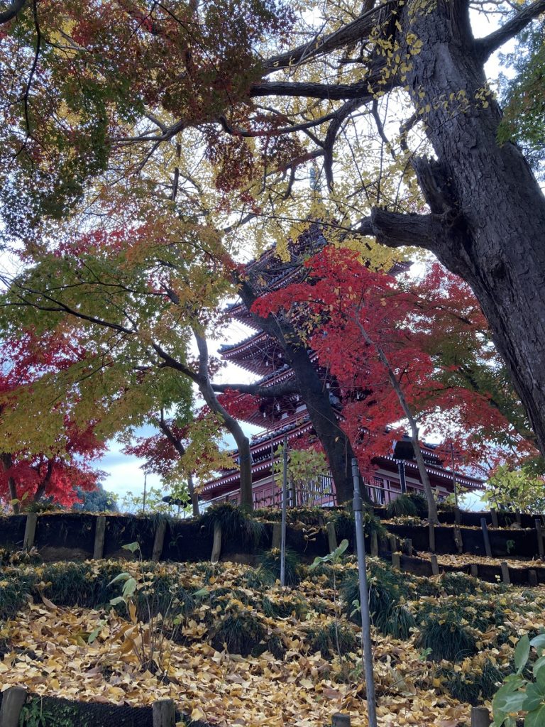 紅葉とイチョウと五重塔、とても良いです。なんとなく京都に来たような雰囲気を味わえます。この後五重塔の階段のところで、恐らく新婚さんでしょうか、撮影会が始まりました。最高の構図ですね(´▽`)