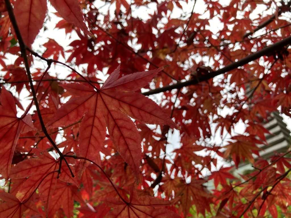 本堂脇の紅葉、裏から見たら葉脈がくっきりと透過出来ました。
